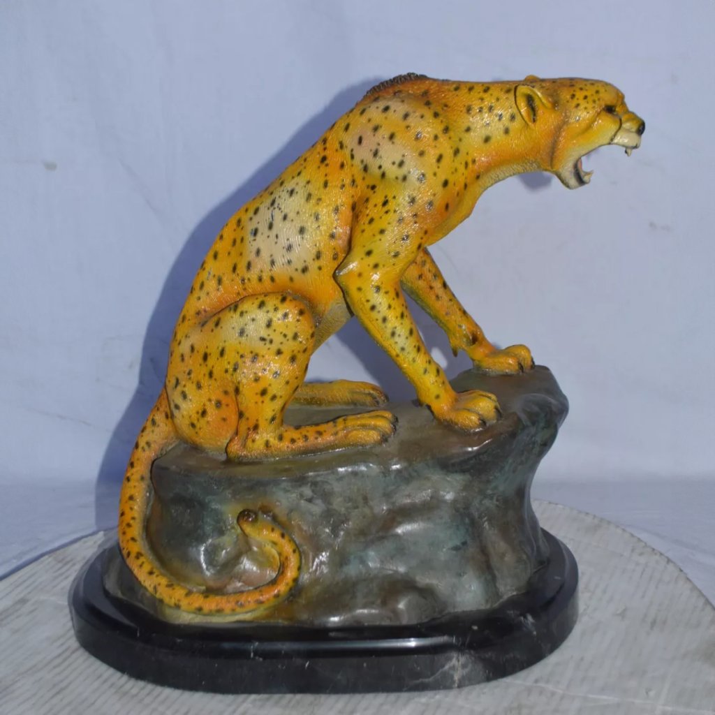 الفهد (Acinonyx jubatus) هو أسرع حيوان على اليابسة، ويوجد بشكل رئيسي في أفريقيا جنوب الصحراء الكبرى وأجزاء من إيران. يشتهر الفهد بتركيبته الجسدية الفريدة، وبصره الحاد، وقدرته الفائقة على الجري. بالمقارنة مع القطط الأخرى، يمتلك الفهد جسماً أكثر رشاقة، وأطرافاً مرنة، وذيلاً طويلاً وقوياً، مما يوفر توازناً ممتازاً عند الجري بسرعات عالية. عادة ما يكون فرائه ذهبياً أو بيج، مع بقع سوداء صغيرة وكثيفة على أجسادها، مما يساعد الفهود على إخفاء نفسها في بيئات مثل الأراضي العشبية. يظهر تمثال الفهد النحاسي هذا بوضوح وحشية الفهد وقوته.