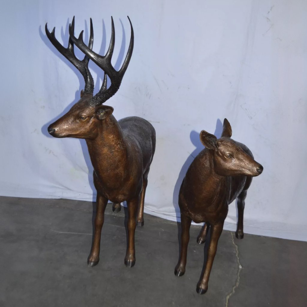 يعرض هذا الزوج من التماثيل البرونزية بشكل حيوي زوجًا من الغزلان الواقعية، مع منحوتات دقيقة وتفاصيل غنية. على يسار تمثال الأيل والظبية يوجد ذكر غزال، بقرنين رائعين، تتفرع منهما الفروع في جميع الاتجاهات، مهيب ومثير للرهبة، يظهر قوته الذكورية ومزاجه النبيل. يتميز ذكر الغزال في زينة الغزلان بالحجم الطبيعي للجنائن بجسم مستقيم، وخطوط عضلية ناعمة، ويتم تقديم نسيج فرائه من خلال النحت الدقيق للبرونز، كما لو كان يمنح التمثال إحساسًا بالحياة.
