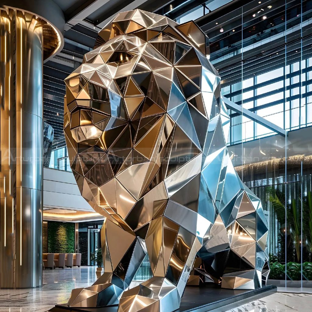Esta escultura de león geométrica de acero inoxidable Sculpture es una obra maestra del arte escultórico moderno que integra estética, artesanía y significado simbólico. Muestra el extraordinario talento de los artistas contemporáneos en el uso de materiales y la creación de formas. Es una perla brillante en el espacio de arte público.