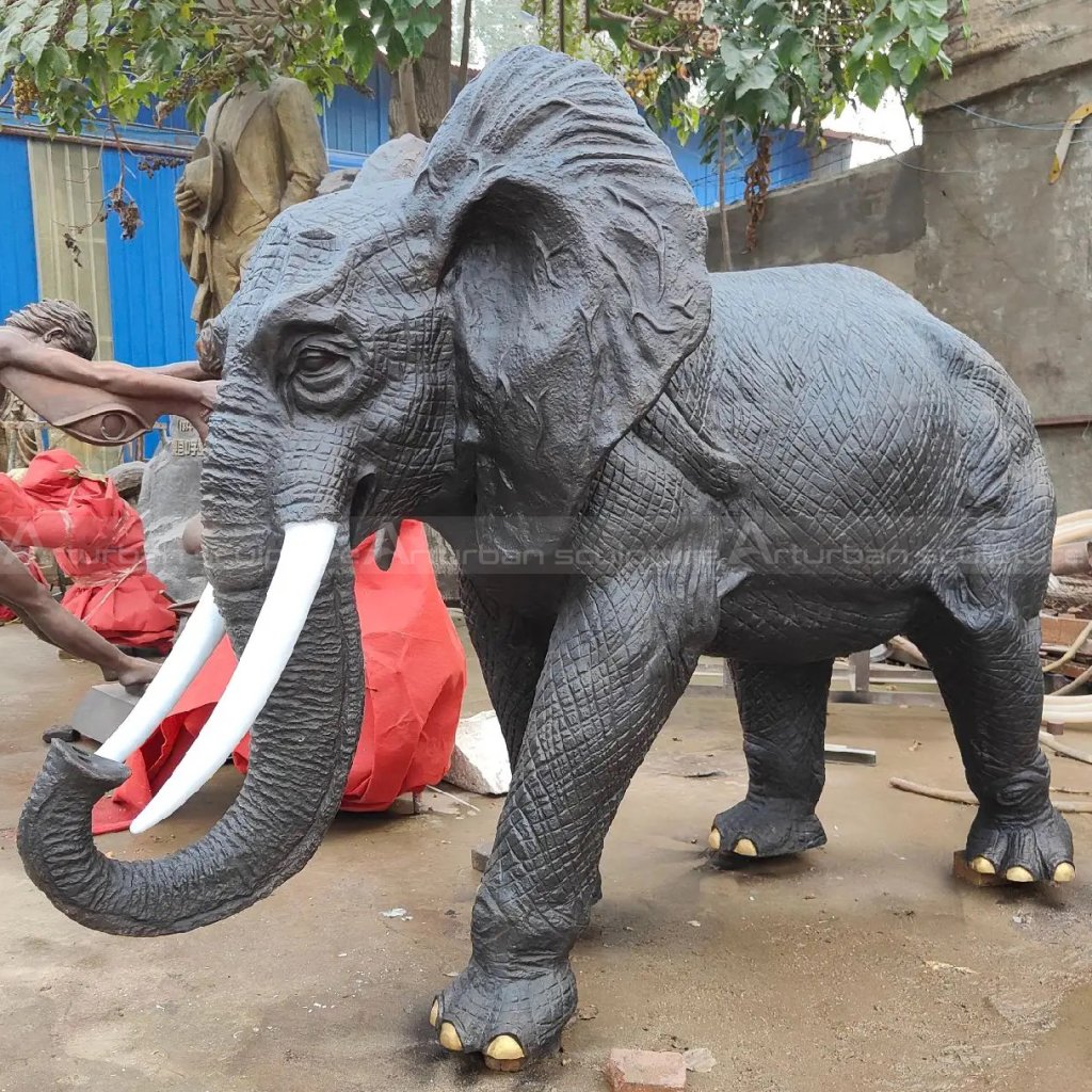 Cette sculpture d’éléphant en fibre de verre dégage la majesté et la beauté de l’éléphant. La totalité de la Belle Statue d’Éléphant utilise le noir comme couleur principale, et sa surface bénéficie d’un traitement de texture délicat, ce qui rend la texture de la peau de l’éléphant très réaliste. La trompe de l’éléphant de la sculpture est courbée et les défenses sont blanches et lisses, ce qui forme un contraste saisissant avec le corps noir, soulignant la force et la solennité de l’éléphant.