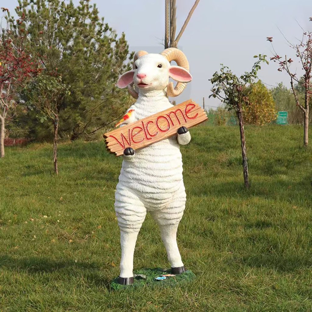 Deux moutons tiennent des pancartes avec le mot « bienvenue » et accueillent chaleureusement chaque visiteur avec leurs yeux doux et leurs sourires bienveillants. Les deux moutons du milieu poussent ou tirent une charrette. Le design de la charrette est exquis et pratique, ajoutant une touche de vie aux Statues de Moutons en Résine. Les deux derniers moutons, l’un porte un panier et l’autre en tient un. Le panier peut être rempli de fruits de la récolte ou de bons vœux, attendant d’être partagés avec les gens.