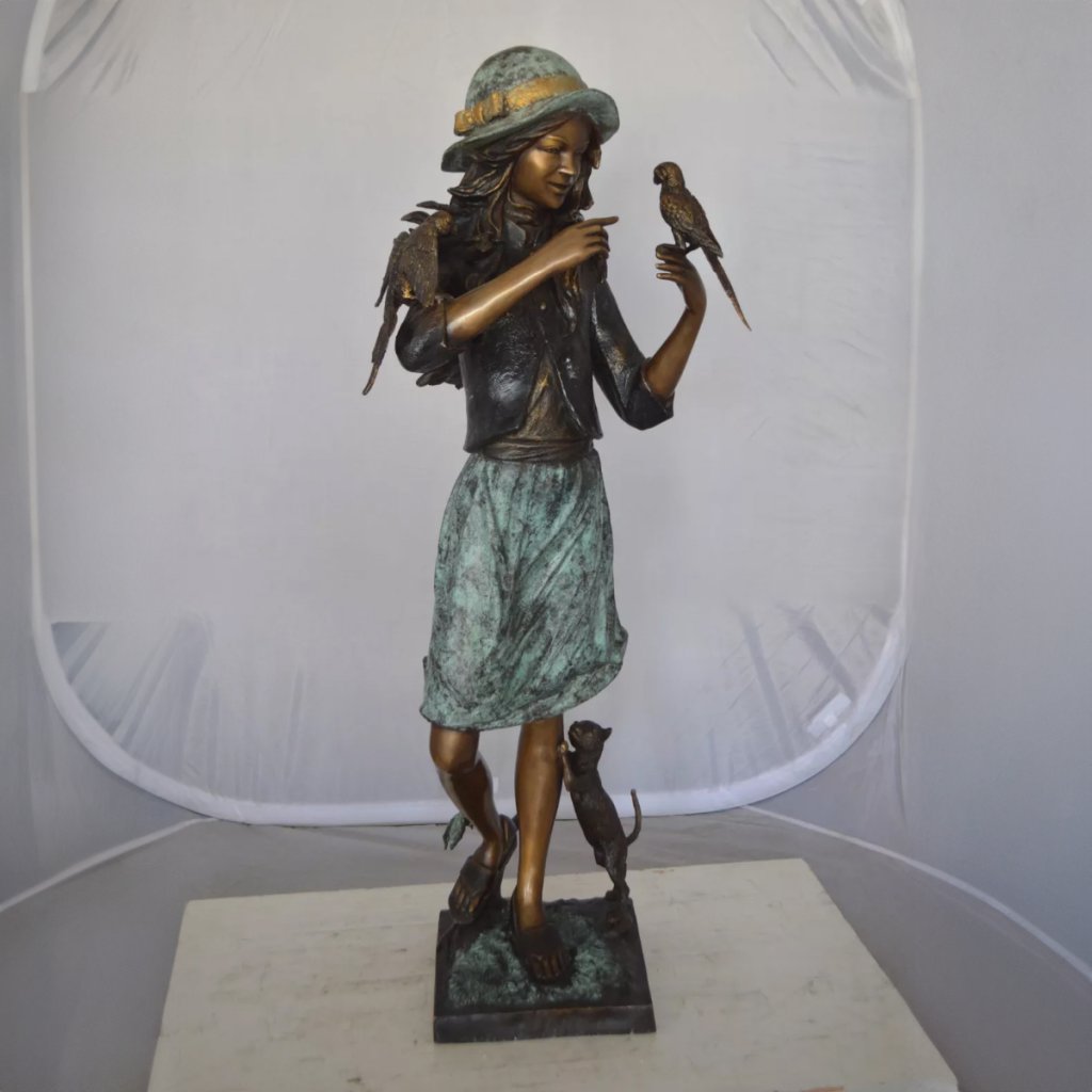 Questa scultura in bronzo raffigura delicatamente una ragazza in piedi, mostrando la bellezza armoniosa del calore e della natura. In questa Scultura di Ragazza e Pappagalli, la ragazza indossa un cappello a tesa larga con un delicato nastro decorativo sul bordo, e i suoi lunghi capelli cadono naturalmente. Sulla sua mano sinistra si trova un pappagallo realistico, e un altro pappagallo è appollaiato sulla sua spalla destra con le ali spiegate, come se fosse pronto a volare in qualsiasi momento. La ragazza sorride e ha occhi gentili, rivelando la sua stretta relazione con la natura e gli animali.