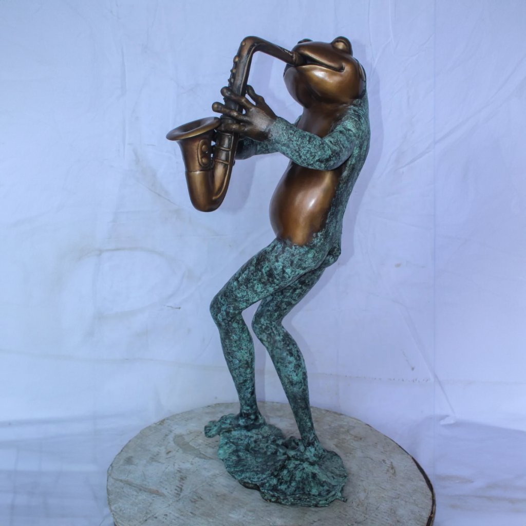 Questa scultura in bronzo mostra vividamente una scena divertente di una rana che suona il sassofono. Nelle Statue di Rane Musicali, la testa e l’addome della rana sono di bronzo, mentre le sue zampe e la schiena presentano un verde rame più evidente, con stratificazioni distinte e delicati cambi di colore che rendono la scultura ancora più vivida.