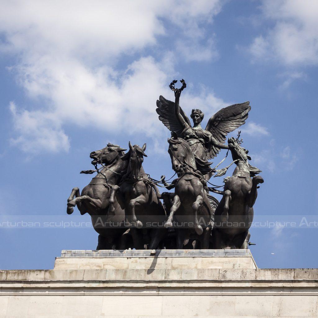 Le statuette di angeli sono realizzate in bronzo. I quattro cavalli alzano i loro zoccoli anteriori, ruggiscono verso il cielo e corrono in avanti con forme diverse, con lo slancio di diecimila cavalli al galoppo. I due cavalli nel mezzo erano un po’ lusingati, come se stessero ascoltando le istruzioni. L’angelo stava sul carro, tenendo una corona d’alloro in una mano e un ramo d’ulivo nell’altra, come se guidasse il cavallo verso la vittoria e la pace. La corona d’alloro sulla sua testa simboleggia lo scopo del suo arrivo, e le sue ali aperte mostrano che è desideroso di conferire questo onore al suo popolo.