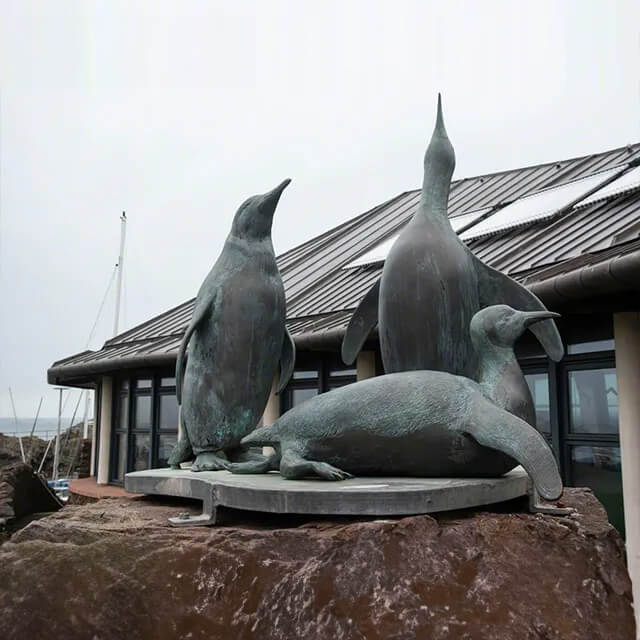 The first penguin of the Outdoor Penguin Statue is in a standing posture, with an upright body and a slightly raised head, giving people a solemn and majestic feeling. The second penguin is in a prone position, seemingly resting or interacting with the surrounding environment, showing the peaceful side of the emperor penguin. The third penguin is also in a standing position. The Bronze Penguin Statue is made of bronze, and the surface presents a natural patina effect, which increases the historical sense of the sculpture. Arturban Sculpture can customize various animal statues. Welcome to contact us for more details.