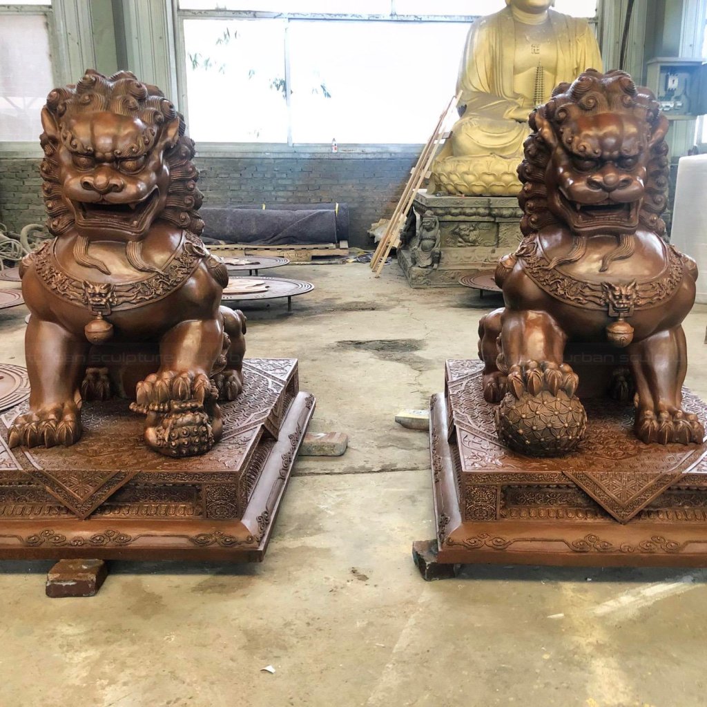 A base deste par de esculturas de Foo Dog é lindamente projetada e esculpida com padrões e designs complexos, o que realça a beleza geral e a atmosfera cultural das esculturas. O material de bronze não só confere às Esculturas de Foo Dog uma cor e textura simples, mas também possui durabilidade extremamente alta e resistência à corrosão, adequado para colocação de longo prazo ao ar livre ou em ambientes internos, não afetado pelo ambiente.