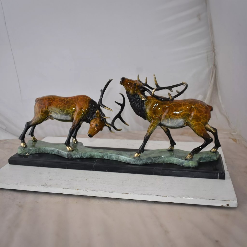 Esta escultura reproduz vividamente o momento de dois cervos em confronto feroz através de um trabalho artesanal requintado. Os cervos na Estátua de Cervo em Bronze são majestosos e poderosos, e as galhadas de cada cervo são cuidadosamente esculpidas, com detalhes vívidos de chifres curvados e ramificações naturais. As linhas musculares dos cervos são claramente visíveis, e o delicado entalhe torna seus movimentos mais vívidos, como se estivessem congelados no momento da batalha.