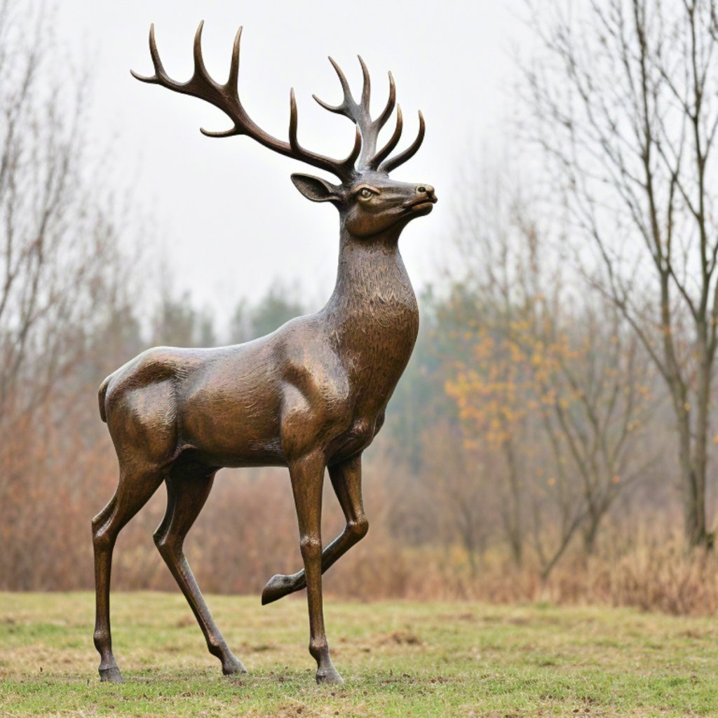 O veado-vermelho (Cervus elaphus) é uma das maiores espécies da família Cervidae. A característica distintiva do veado-vermelho macho são suas galhadas ramificadas e semelhantes a galhos, que podem atingir mais de 1 metro de comprimento. Elas caem e crescem novamente a cada primavera. A cor do seu pelagem muda com as estações, ficando marrom-avermelhada no verão e marrom-acinzentada ou marrom-escura no inverno para se adaptar ao ambiente frio. Os veados-vermelhos são distribuídos principalmente em partes da Europa, Ásia central e ocidental e norte da África. Eles geralmente habitam bordas de florestas, pastagens e arbustos, e especialmente preferem áreas com abundantes fontes de água. Como animal social, os veados-vermelhos geralmente se movem em grupos de veados fêmeas e machos. Durante a época de reprodução, os veados machos atraem as fêmeas rugindo e exibindo suas galhadas. A Estátua de Veado em Pé na imagem demonstra vividamente a elegância e o poder do veado-vermelho.